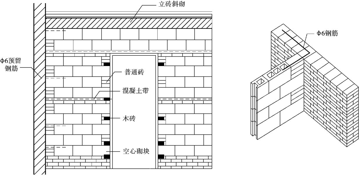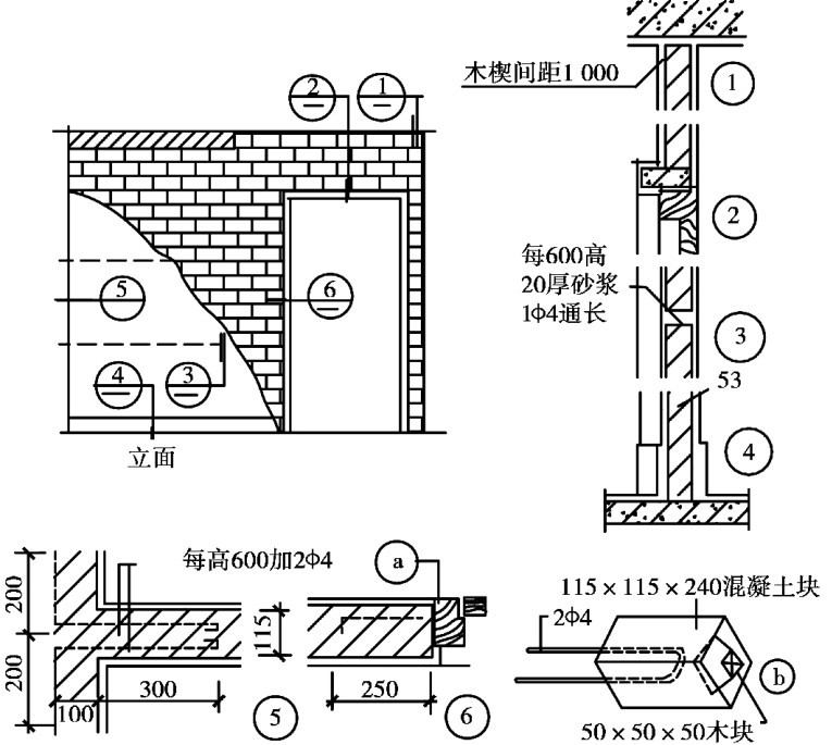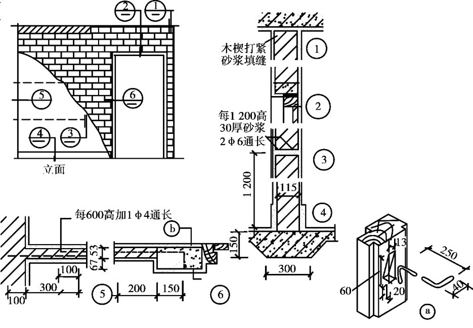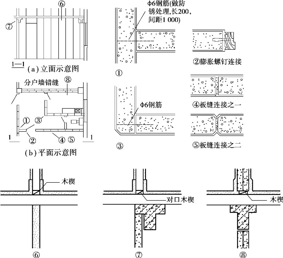 1/4砖隔墙是由普通砖侧砌而成,由于厚度较薄、稳定性差,对砌筑砂浆强度要求较高,一般不低于M5。 隔墙的高度和长度不宜过大,且常用于不设门窗洞的部位,如厨房与卫生间之间的隔墙。 若面积大又需开设门窗洞时,须采取加固措施,常用方法是在高度方向每隔500mm砌入 4钢筋2根,或在水平方向每隔1200mm,立200号细石混凝土柱一根,并沿垂直方向每隔7匹砖砌入 6钢筋1根,使之与两端墙连接(图7.42)。