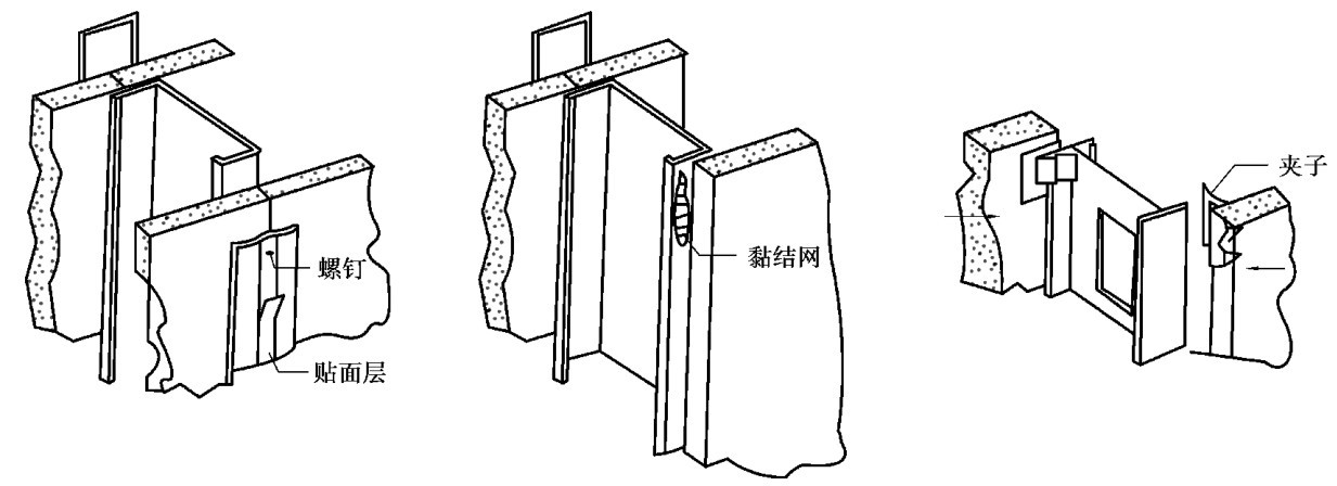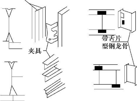 人造板在骨架上的固定方法有钉、粘、卡三种(图7.48)。 采用轻钢骨架时,往往用骨架上的舌片或特制的夹具将面板卡到轻钢骨架上。 这种做法简便、迅速、有利于隔墙的组装和拆卸。 图7.49为几种常用的型钢骨架和夹具。