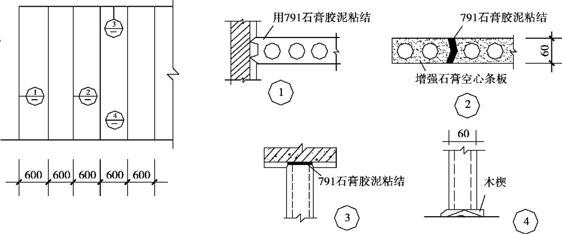 碳化石灰板是以磨细的生石灰为主要原料,掺3%~4%(质量比)的短玻璃纤维,加水搅拌,振动成型,利用石灰窑的废气碳化而成的空心板。 一般的碳化石灰板的规格为长2700~3000mm,宽500~800mm,厚90~120mm。 板的安装同加气混凝土条板隔墙(图7.51)。