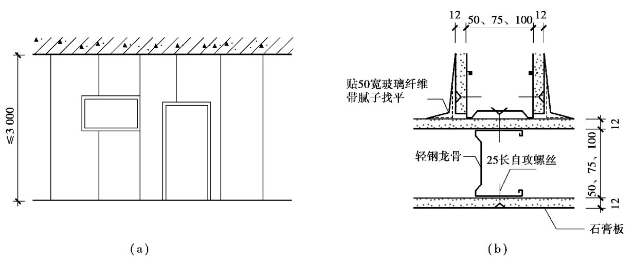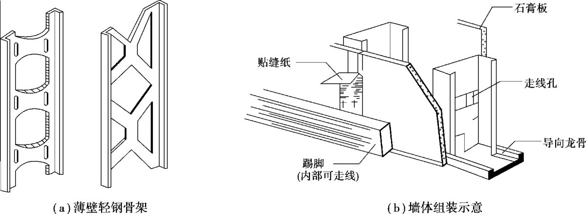 图7.45为一种薄壁轻钢骨架的轻隔墙。 其安装过程是先用螺钉将上槛、下槛(也称导向骨架)固定在楼板上,上下槛固定后安装钢龙骨(墙筋),间距为400~600mm,龙骨上留有走线孔。