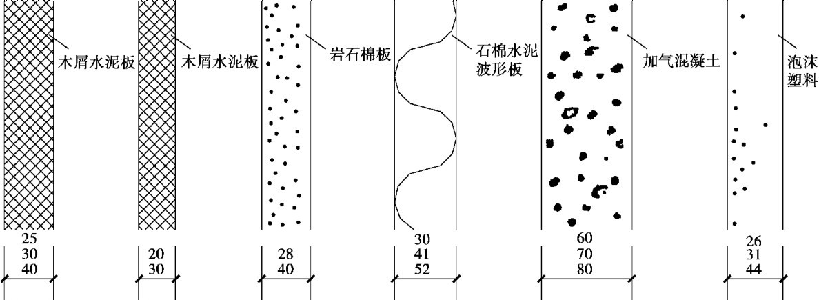 复合板充分利用材料的性能,大多具有强度高、耐火性、防水性、隔声性能好的优点,且安装、拆卸简便,有利于建筑工业化。 图7.54为几种日本生产的石棉水泥板面的复合板。