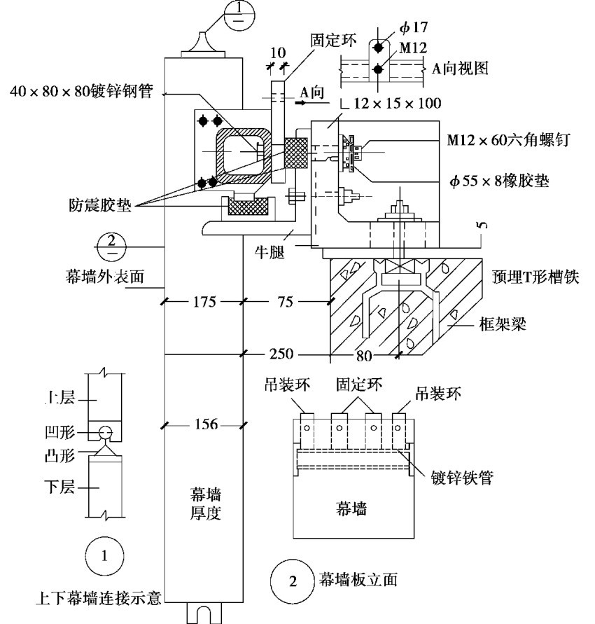 幕墙板与主体结构的梁或板的连接应达到完全柔性连接的要求,以起到防震作用和适应结构变形。 图7.79表示幕墙板与框架梁的连接详图,先在幕墙板背面装上一根镀锌方钢管(俗称铁扁担,图7.79中立面图虚线所示),幕墙板通过这根铁扁担支搁在角形钢牛腿上。 为了防止振动,幕墙板与牛腿接触处均垫上防振橡胶垫。 当幕墙板就位找正后,随即用螺栓将铁扁担固定在牛腿上,而牛腿是通过预埋槽铁与框架梁相连的。