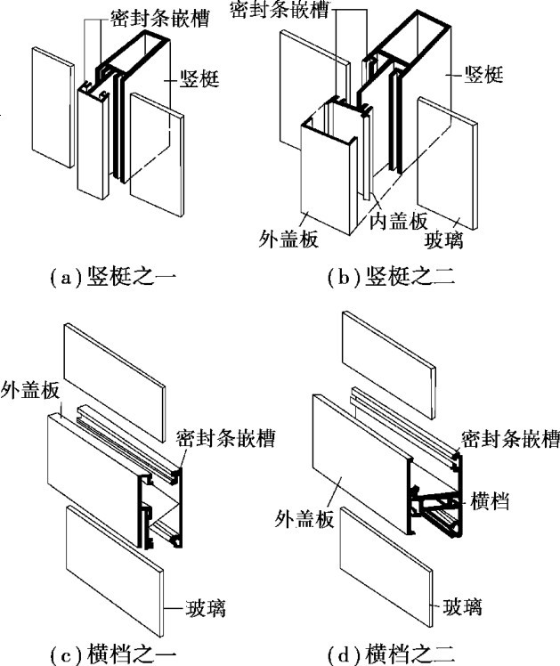 金属边框可用铝合金、铜合金、不锈钢等型材做成。 铝合金型材易加工、外表美观、耐久、质轻、是玻璃幕墙较理想的边框材料。 铝型材有实腹和空腹两种。 空腹节约材料、刚度好、对抗风有利;竖梃和横档的断面形状根据受力、框料连接方式、玻璃安装固定、幕墙凝结水的排除等因素确定。 各个生产厂家的产品系列各不相同,图7.73是国内一些玻璃幕墙所采用的边框型材断面取例。 为了便于安装和更换玻璃,常常由两块甚至三块型材组合成一根竖梃或一根横档,如图7.69(b)、(c)、(d)分别由三块和两块型材咬合,构成所需要的断面形状。