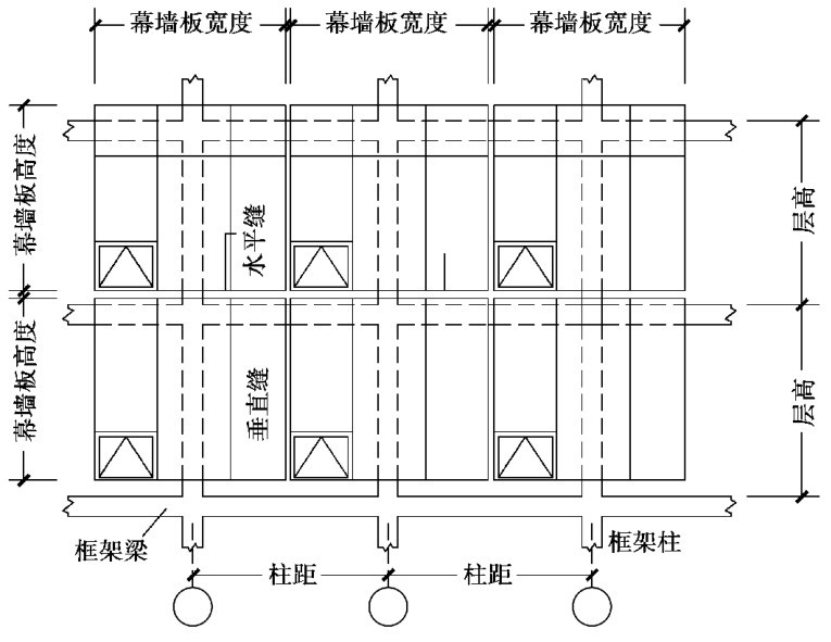 幕墙定型单元在建筑立面上的布置方式称为立面划分。 分件式幕墙的立面常以竖梃拉通为特征,而板块式幕墙在大多数情况下采用竖缝和横缝各自拉通形成方格形立面,有时也可采取将竖缝错开而横缝拉通的布置形式。 通常每块定型单元的高度等于楼层高度,每块定型单元的宽度视运输安装条件确定,一般为3~4m。 进行立面划分时,上下墙板的接缝(横缝)略高于楼面标高(200~300mm),以便安装时进行墙板固定和板缝密封操作,左右两块幕墙板之间的垂直缝宜与框架柱错开。 所以幕墙板的竖缝和横缝应分别与结构骨架的柱中心线和楼板梁错开,如图7.78所示。