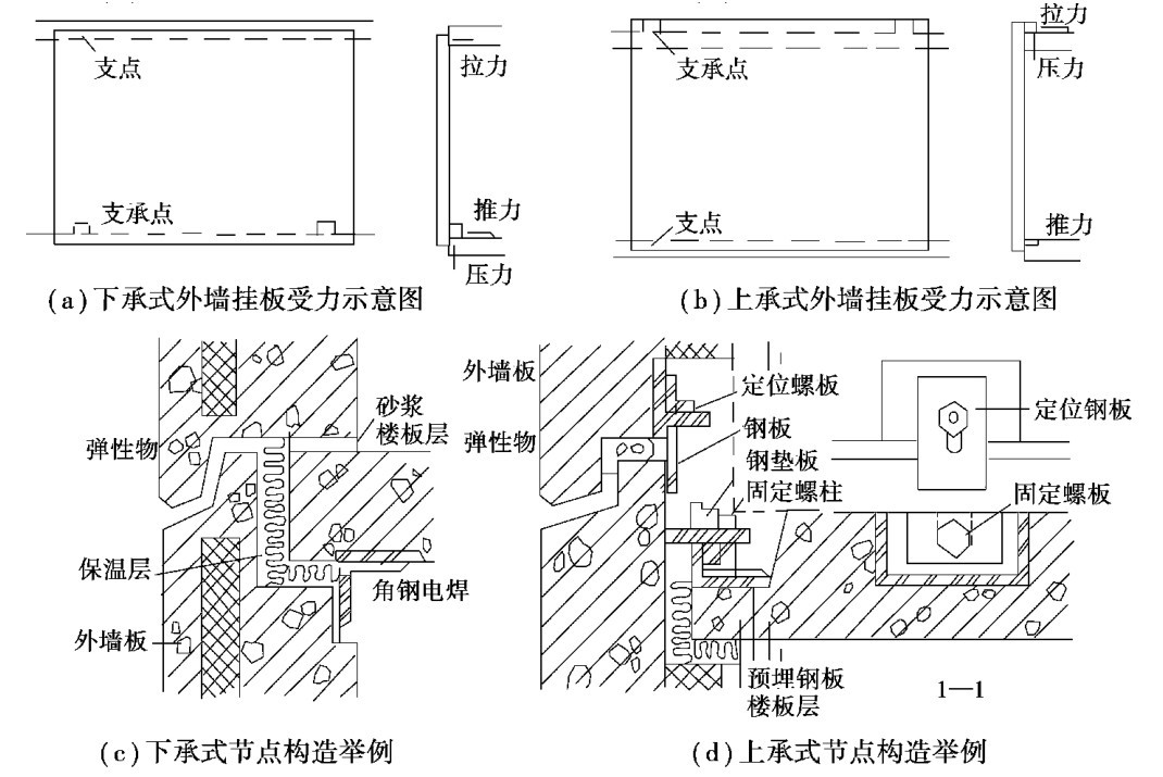 多数采用在工厂预制的单元式轻混凝土墙板,运到工地进行安装。 单元式墙板一般与前述大型板材的外墙板类同,其与楼板的结合方式有上承式和下承式两种;上承式悬挂在上部楼板上,下部只要一般的拉接(如图7.67b、d);下承式搁置在下部楼板,上部拉接(如图7.67a、c)。