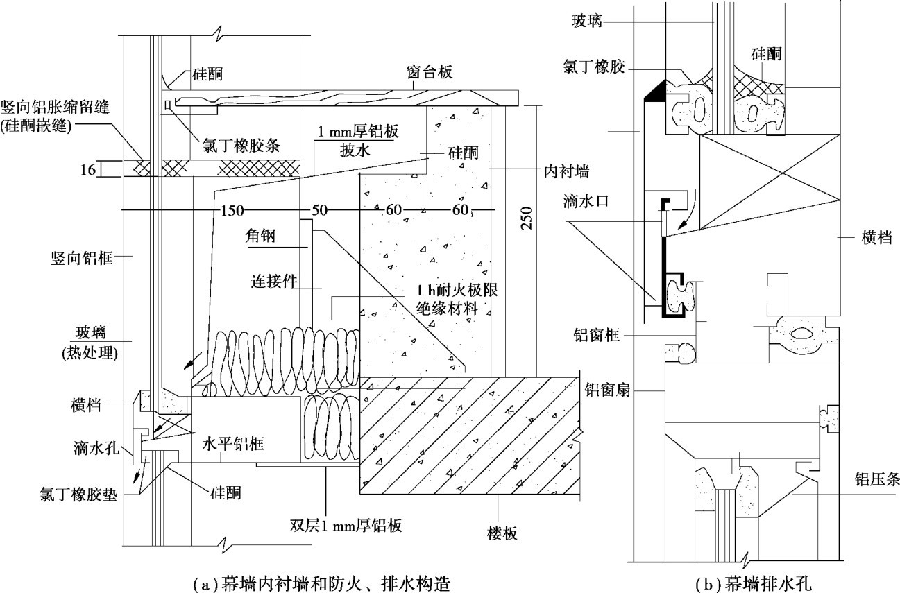 由于玻璃幕墙的保温性能差,在玻璃、铝框、内衬墙和楼板外侧等处,在寒冷天气会出现凝结水。因此,要设法将这些凝结水及时排走,可将幕墙的横档做成排水沟槽,并设滴水孔,如图7.75 (b)。此外,还应在楼板侧壁设一道铝制披水板,把凝结水引导至横档中排走,如图7.75(a)。