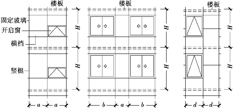 板块式玻璃幕墙在工厂将玻璃、铝框、保温隔热材料组装成一块块的幕墙定型单元,每一单元一般由3~8块玻璃组成,每块玻璃宽不宜超过1.5m,高不宜超过3m。 图7.77为幕墙定型单元示例,由于高层建筑大多用空调来调节室内气候,故定型单元的大多数是固定的,只有少数玻璃扇开启。 开启方式多用上悬窗或推拉窗,开启扇的大小和位置根据室内布置要求确定。