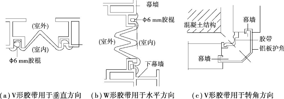 玻璃镶嵌在金属框上必须保证接缝处的防水,根据对已建成的玻璃幕墙的调查,其渗水的关键部位是玻璃与金属结合缝处。 暴露在大气的幕墙结构,由于受热、风和其他应力的影响,容易变形,同时,嵌固玻璃的金属框和玻璃,在热作用下因膨胀系数不同产生剪切应力,使接头错动以及密封层受拉超过弹性限度而失去密封作用,因此,接缝构造设计必须综合考虑各种因素,以适应不同情况的要求。
