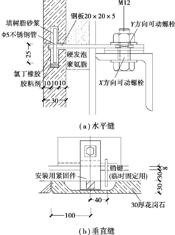 主要采用天然花岗岩石做面料的幕墙,背后为金属支撑架。 花岗石色彩丰富,质地均匀,强度及抗拒大气污染等各方面性能较佳,因此深受欢迎。 用于高层的石板幕墙,板厚一般为30mm,分格不宜过大,一般不超过900 mm×900 mm。 它的最大允许挠度限定在长度的1/2000~1/1500,所以支撑架设计须经过结构精确计算,以确保石板幕墙质量安全可靠(如图7.66)
