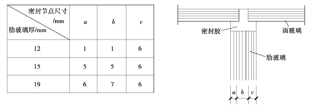 面玻璃与肋玻璃相交部位宜留出一定的间隙。 间隙用硅酮系列密封胶注满。 间隙尺寸可根据玻璃的厚度而略有不同,具体详细的尺寸如图7.85。