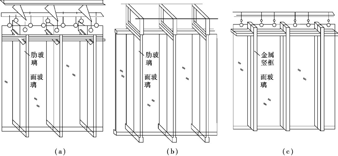 ③不用肋玻璃,而是用金属竖框来加强面玻璃的刚度,如图7.82(c)所示。