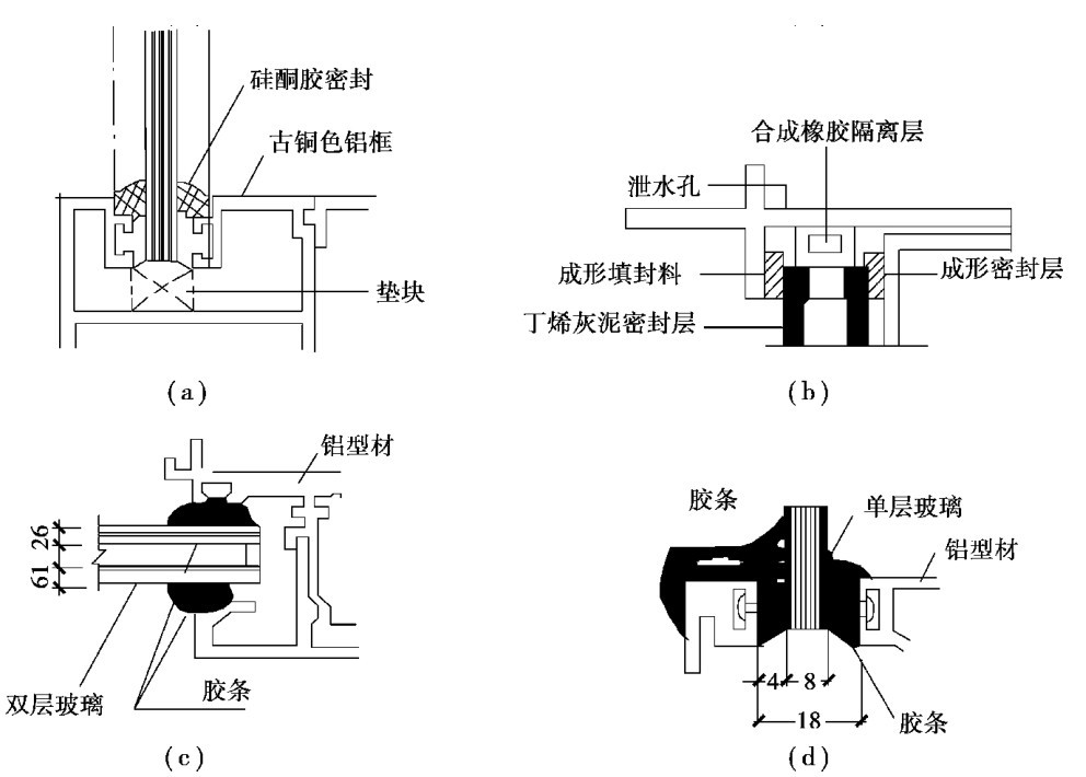 玻璃是由垫块支撑在金属框内,玻璃与金属框之间形成空腔。 空腔可防止挤入缝内的雨水因毛细现象进入室内。 图7.73为玻璃镶嵌在金属框中的节点详图。
