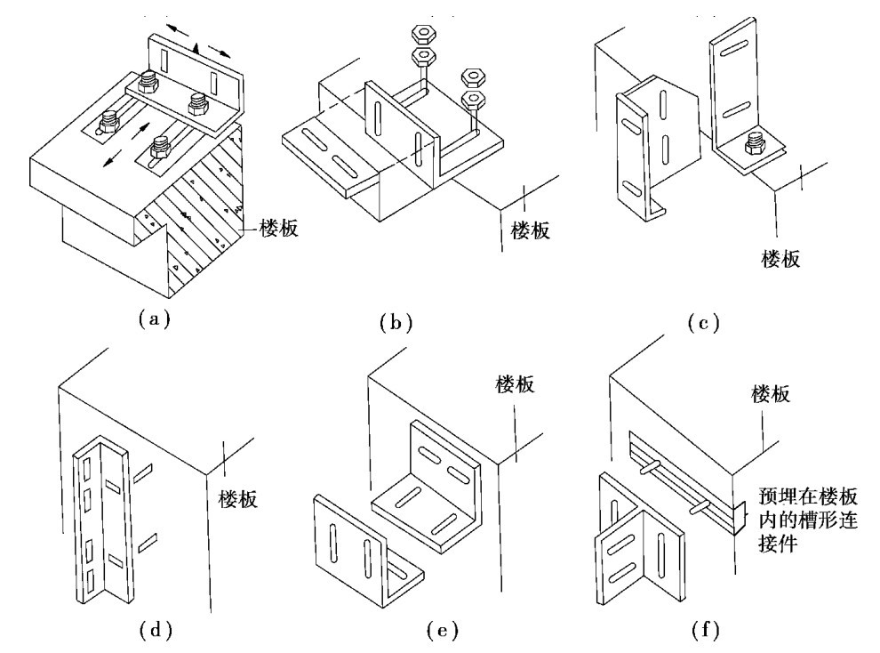 竖梃通过连接件固定在楼板上,连接件的设计与安装,要考虑竖梃能在上下左右前后六个方向均可调节移动,所以连接件上的所有螺栓孔都设计成椭圆形的长孔。 图7.70是几种不同的连接件示例。 连接件可以置于楼板的上表面、侧面和下表面,一般情况是置于楼板上表面,便于操作,故采用得较多。 竖梃和楼板之间的间隙一般为100mm左右。