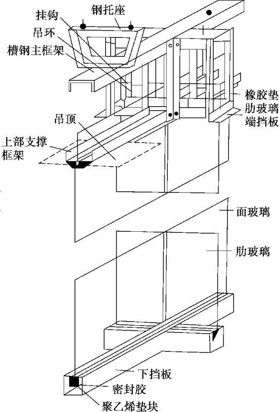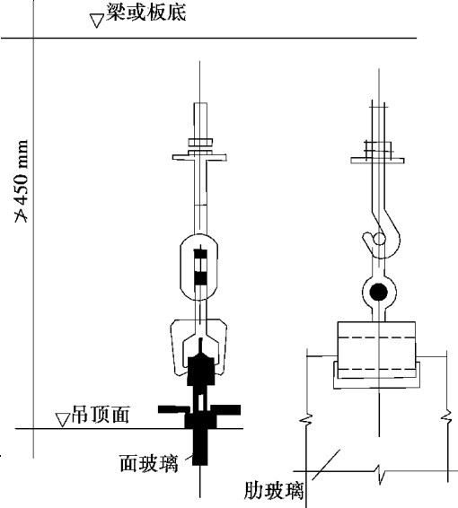 ①用悬吊的吊钩,将肋玻璃及面玻璃固定。 这种方式多用于高度较大的单块玻璃,如图7.82(a)所示。