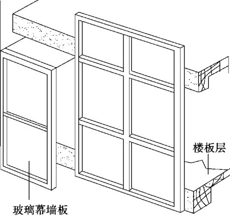 分件式玻璃幕墙是在施工现场将金属边框、玻璃、填充层和内衬墙,以一定顺序进行组装。玻璃幕墙通过边框把自重和风荷载传递到主体结构,有两种方式:通过垂直方向的竖梃或通过水平方向的横档。 采用后一种方式时,需将横档支搁在主体结构立柱上,由于横档跨度不宜过大,要求框架结构立柱间距也不能太大,所以实际工程中并不多见,而多采用前一种方式,如图7.68所示。