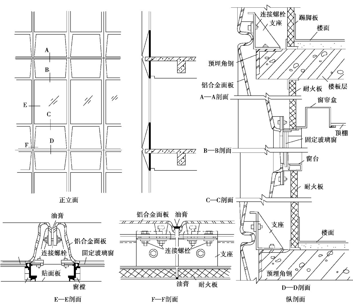 采用专用的模具压制,使单层铝合金板成为立体几何形或瓦楞形组装式幕墙单元,安装上玻璃窗,并在窗肚或窗间墙处内部敷设防火材料、保温层和内饰面层(如图7.65)。