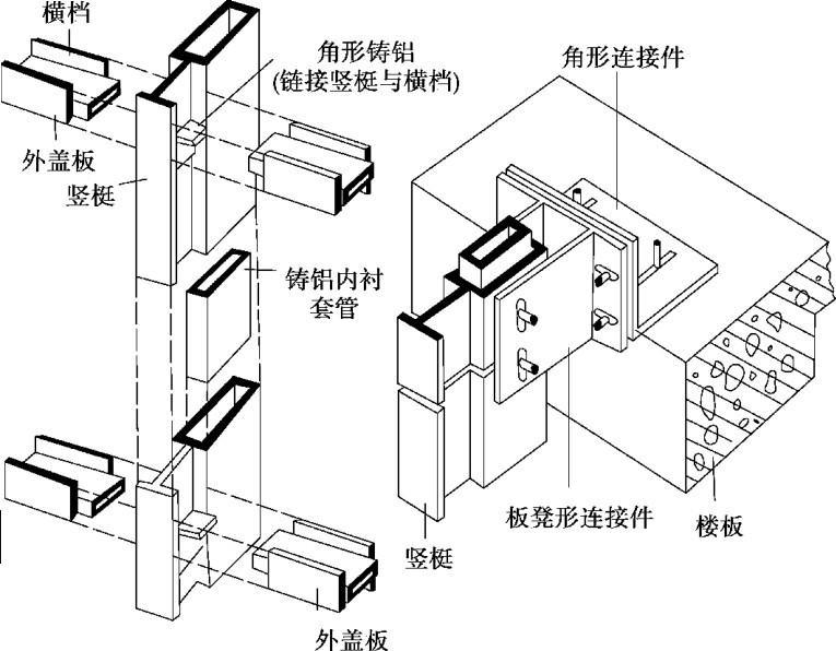 竖梃和楼板通过角形铝铸件连接。 角铝与竖梃、角铝与横档均用螺钉固定,如图7.71 (a)。 上下竖梃之间通过一个内衬套管连接牢固,上下竖梃之间应留15~20mm的胀缩缝隙,并用密封胶堵严。 图7.71(b)表示出竖梃与竖梃的连接、竖梃与楼板的连接关系。