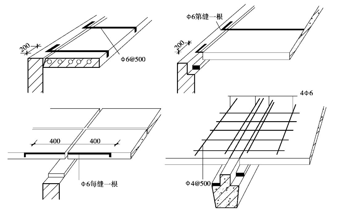 为了增强楼板的整体刚度,特别是处于地基条件较差或地震地区,应在板与墙以及板端与板端连接处设置锚固钢筋,如图8.18所示。