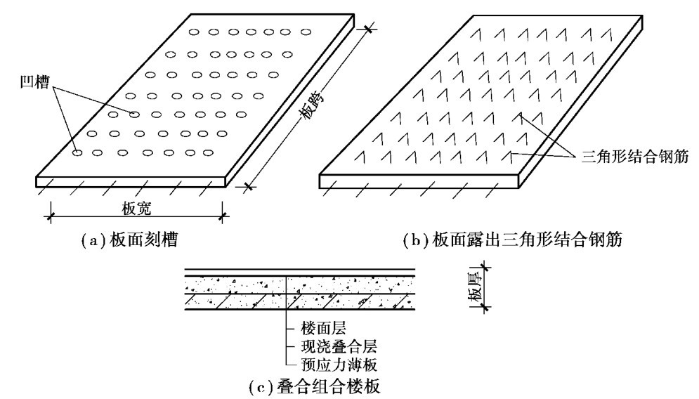 叠合楼板跨度一般为4~6m,最大可达9m,以5.4m以内较为经济。 预应力薄板厚50~70mm,板宽1.1~1.8m。 为了保证预制薄板与叠合层有较好的连接,薄板上表面需做处理。常见的有两种:一种是在上表面作刻槽处理,如图8.20(a)所示,刻槽直径50mm,深20mm,间距150mm;另一种是在薄板上表面露出较规则的三角形状的结合钢筋,如图8.20(b)所示。