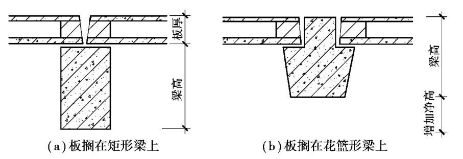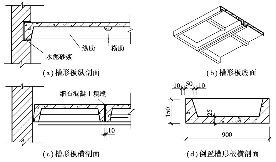 搁置时,板有正置(指肋向下)与倒置(指肋向上)两种。 正置板由于板底不平,有碍观瞻,多做吊顶。 倒置板可保证板底平整,但需另做面板,有时为考虑楼板的隔声或保温,亦可在槽内填充轻质多孔材料。 图8.10为正置槽形板的示意图。