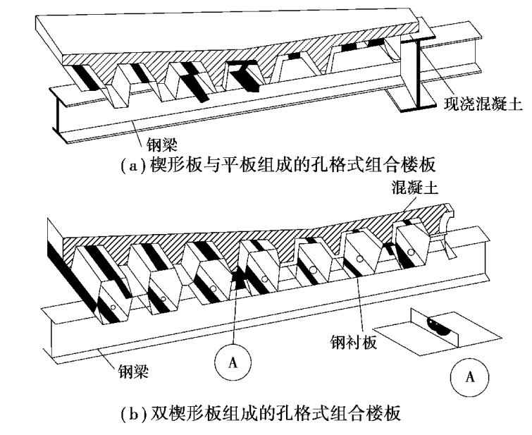 双层孔格式钢衬板组合楼板的构造如图8.23所示。 图8.23(a)是在压型钢板下加一张平板钢,在钢衬板下形成封闭形空腔A,这样使承载能力提高。