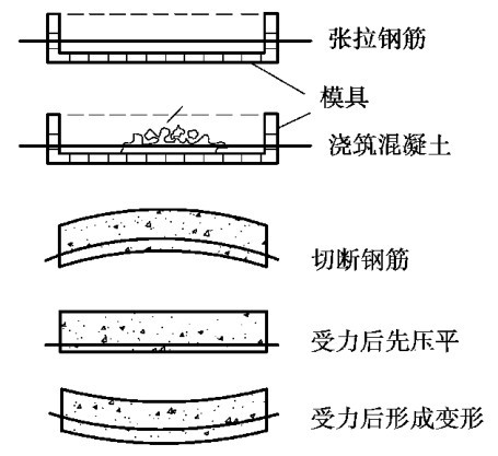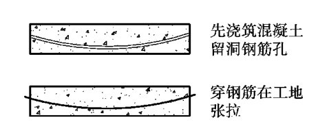 这种加工厂先预先制作,再运到现场安装的预制楼板,可提高施工机械化水平,缩短建设周期,对建筑工业化、生产水平的提高是一大促进,目前已得到广泛应用。 预制楼板有非预应力和预应力两种。 预应力是使构件下部的混凝土预先受压,这叫预压应力。 混凝土的预压应力使通过张拉钢筋的办法来实现。 钢筋的张拉有先张和后张两种工艺。 先张法是先张拉钢筋、后浇筑混凝土,待混凝土有一定的强度以后切断钢筋,使回缩的钢筋对混凝土产生压力,如图8.7所示;后张法是先浇筑混凝土,在混凝土的预留孔洞中穿放钢筋,再张拉钢筋并锚固在构件上,由于钢筋收缩对混凝土产生压力,使混凝土受压。 采用预应力钢筋混凝土可以提高构件强度和减少构件厚度。 小型构件一般采用先张法,并多在加工厂中进行。 大型构件一般采用后张法,多在施工现场进行。 目前在我国应优先选用预应力构件,如图8.8所示。