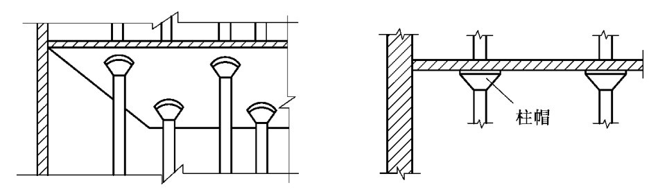 荷载较大,对空间高度、采光、通风又有一定要求的建筑,如商场、书库、多层车库等不宜采用梁板式,而采用无梁式楼板,即将楼板直接支承在柱上。 为提高楼板的承载能力和刚度,必须在柱顶设置柱帽和托板,这是增加柱支撑面积,减小板跨度的方法。 如图8.6所示。 无梁板柱间通常为正方形或接近正方形,柱网尺寸在6m左右,楼面荷载一般≥5k N/m2,小于5k N/m2则不经济,板厚一般大于120mm,为120~190mm。