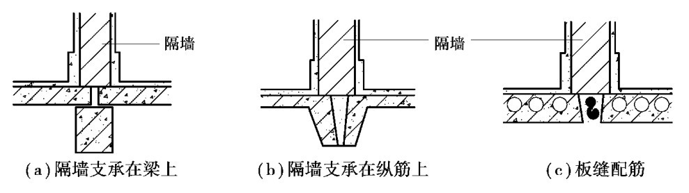 在装配式楼板上采用轻质材料做隔墙时,可将隔墙直接设置在楼板上。 如采用自重较大的材料,如粘土砖作隔墙,则不宜将隔墙直接搁置在楼板上,特别应避免将隔墙的荷载集中在一块板上,通常是设一根梁支承隔墙,如图8.17(a)所示;为了板底平整,可使梁的截面与板的厚度相同或在板缝内配钢筋,如图8.17(c)所示;当楼板为槽形板时,可将隔墙搁置在板的纵肋上,如图8.17(b)所示。