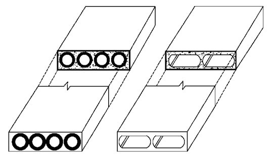 根据板的受力情况,结合考虑隔声的要求,并使板面上下平整,可将预制楼板抽孔做成空心板,如图8.11所示。 空心板的孔洞有矩形、圆形、椭圆形等。矩形孔较为经济但抽孔困难,圆形孔的板刚度较好,制作也较方便,因此使用很广。 根据板的宽度,孔数有单孔、双孔、三孔、多孔。 目前我国预应力空心板的跨度尺寸可以为6m、6.6m、7.2m等。 板的厚度为120~300mm。 当采用空心板做楼板时,板上不宜任意打洞,如需要开孔洞,应在板制作时就预先留孔洞位置。