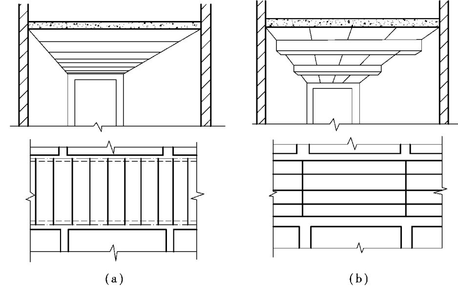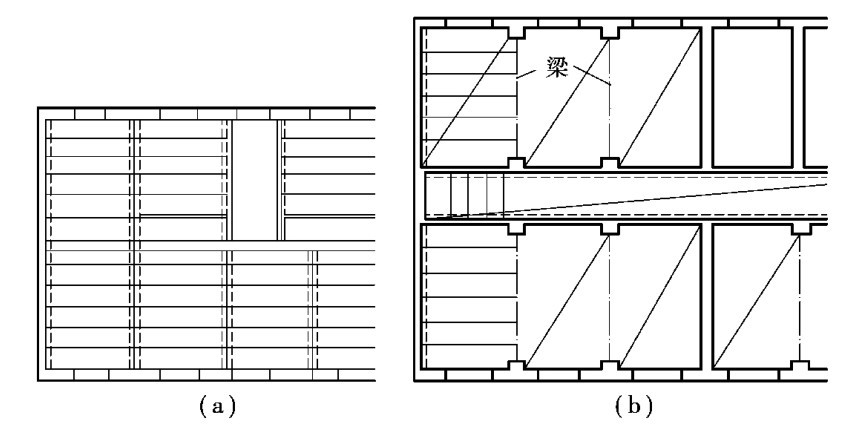 对一个房间进行板的结构布置时,首先应根据其开间、进深尺寸确定板的支承方式,然后根据板的规格进行布置。 板的支承方式有板式和梁板式。 预制板直接搁置在墙上的称为板式布置,若楼板支承在梁上,梁再搁置在墙上的称为梁板式布置,如图8.12所示。 在确定板的规格时,应首先以房间的短边为板跨进行,一般要求板的规格、类型越少越好。 因为板的规格多,不仅施工麻烦,同时容易出错。 狭长空间如走廊处,可沿走廊横向铺板,这种铺板方式采用的板跨尺寸小,板底平整,如图8.13(a)所示。 也可以采用与房间开间尺寸相同的预制板沿走廊纵向铺设,但需设梁支承,当板底不做吊顶时,走廊内可见板底的梁,如图8.13(b)所示。 同时,板的布置应避免出现三面支承,即板的纵向长边不得深入砖墙内,否则在荷载作用下,板会产生纵向裂缝。
