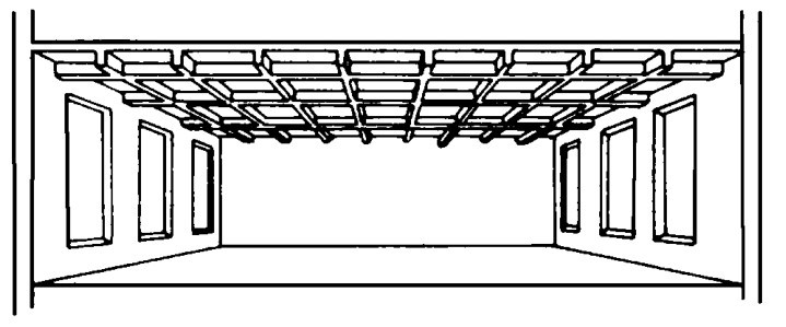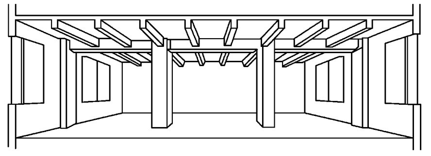 梁板式楼板在结构布置中,承重构件,如柱、梁、墙等应有规律地布置,做到上下对齐,利于结构传力直接,受力合理;空间尺寸超出构件经济尺寸时,应在空间内增设柱子作为梁的支点,使梁跨度在经济尺寸范围内,主梁应沿支点的短跨方向布置,次梁与主梁正交,当空间较大且近似方形,跨度≥10m时,常沿两个方向等尺寸布置构件,即使主梁、次梁方向不分。 梁正截面同高,形成井格式布置,称为井格式楼板,是梁板式楼板结构中的一种特例。 此种楼板布置美观,有装饰效果,梁体可正交正放,亦可正交斜放,其跨度可达30~40m,故常用于建筑物大厅。 如图8.5所示。