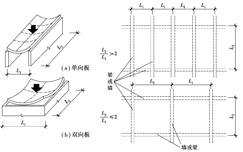 根据梁板式楼板的传力特点和四面支承情况,其中组成部分板又分为单向板和双向板。它们的受力和传力方式是不一样的。当板的长边L2和短边L1之比,即L2/L1>2时,受荷载作用后,板基本只在L1方向挠曲。而在L2方向的挠曲很小。经实验知,传给长边的力仅为1/8左右,这表明荷载主要沿L1方向传递,称为单向板;当L2/L1≤2时,虽长、短边受力仍有区别,但板的两个方向均有挠曲,均不可忽略不计,称为双向板。 如图8.4所示。 从图8.4中可看出,双向板使板的受力更为合理,构件的材料更能充分发挥作用。