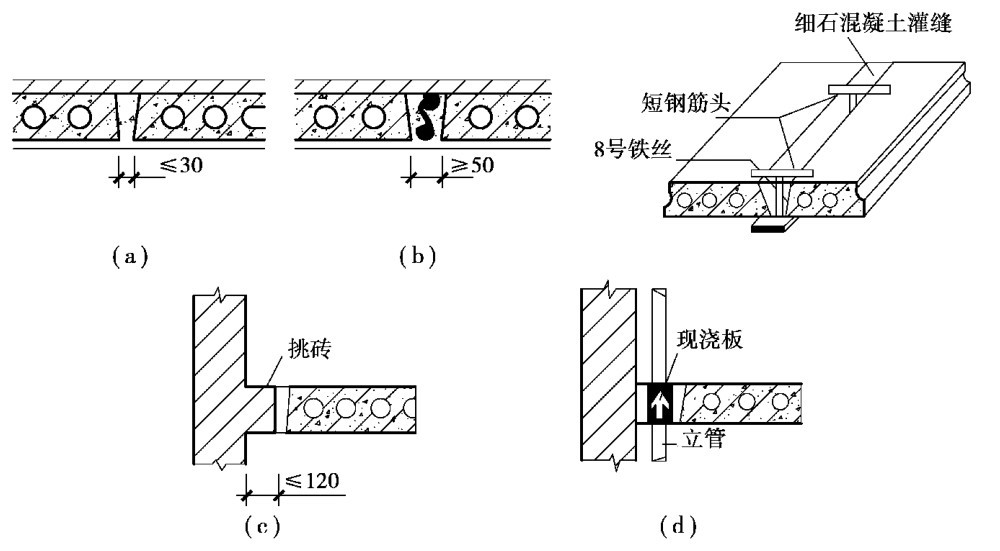 板的排列受到板宽规格的限制,因此,排板的结果常出现较大的缝隙。 根据排板数和缝隙的大小,可考虑采用调整板缝的方式解决。 当其缝≯30mm时,用细石混凝土灌实即可,如图8.16(a)所示;当板缝≥50mm时,应在缝中加钢筋网片再灌细石混凝土,如图8.16(b)所示;当板缝≤120mm时,可将缝留在靠墙处,沿墙挑砖填缝,如图8.16(c)所示;当板缝>120mm时,可采用钢筋骨架现浇板带处理,如楼板为空心板,可将需穿越的管道设在现浇板处,空格如图8.16(d)所示。