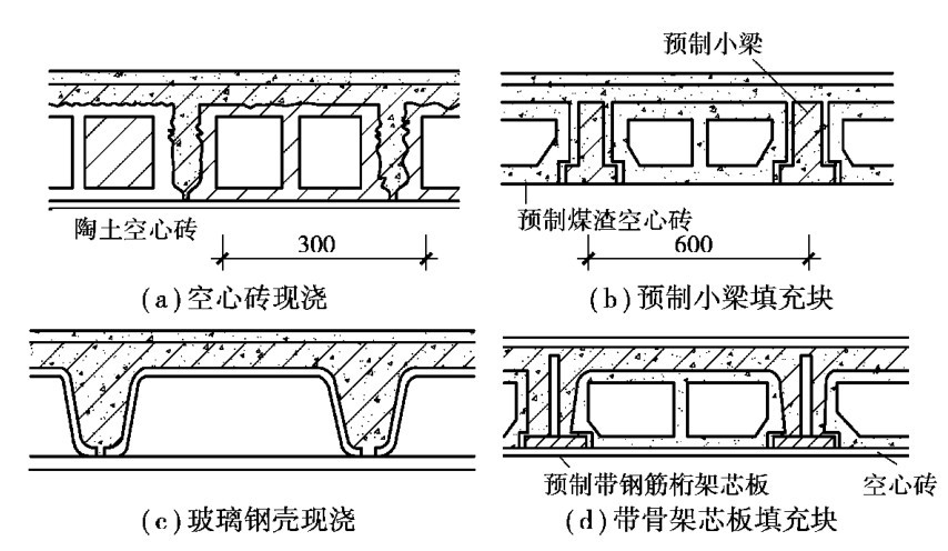 密肋填充块楼板的密肋有现浇和预制两种,前者是在填充块之间现浇密肋小梁和面板,其填充块有空心砖、轻质块或玻璃钢模壳等,如图8.19(a)、(b)所示;后者的密肋常见的有预制倒T形小梁、带骨架芯板等,如图8.19(c)、(d)所示。 这种楼板有利于充分利用不同材料的性能,能适应不同跨度和不规整的楼板,并有利于节约模板。