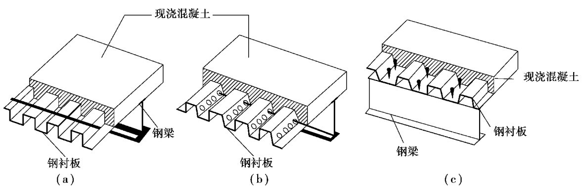 单层钢衬板组合楼板常见的构造如图8.22所示。 图8.22(a)是组合楼板在混凝土的上部仍配有钢筋,加强混凝土面层的抗裂强度即支承处作为承受负弯矩的钢筋。 图8.22(b)是在钢衬板上加肋条或压出凹槽,形成抗剪连接,这时钢衬板对混凝土起到加强钢筋的作用。 图8.22(c)则是在钢梁上焊有抗剪螺栓,保证混凝土板和钢梁能共同工作。