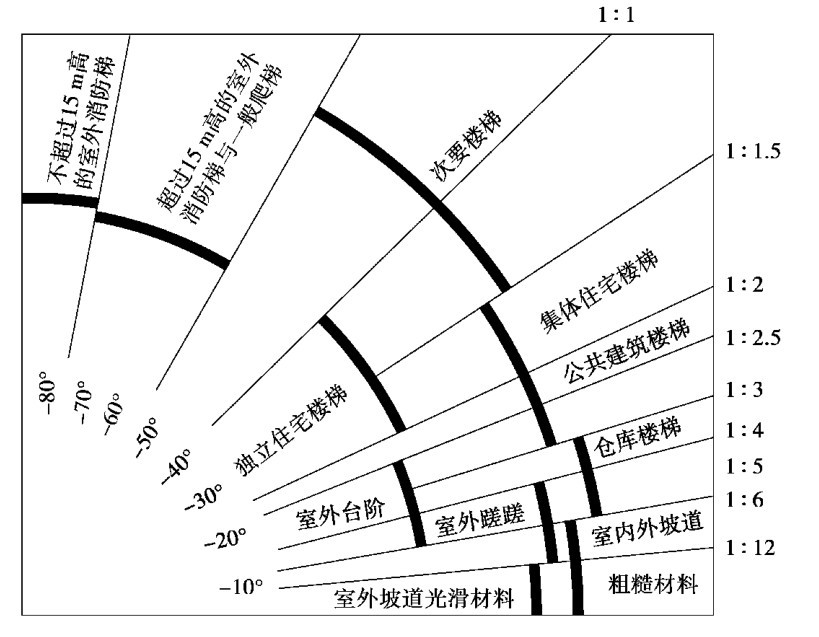 图9.4 爬梯、楼梯和坡道的坡度范围