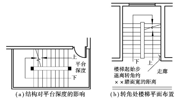 楼梯平面设计主要解决楼梯间的开间、进深尺寸和楼梯梯段、平台水平投影尺寸。