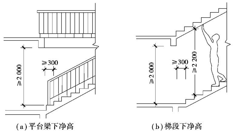 楼梯的净空高度系指梯段任何一级踏步至上一层梯段板底的垂直高度,其值应≥2200mm,或楼地面和平台面至上一层平台底(或平台梁底)的垂直高度,其值应≥2000mm,如图9.5所示。目的是为保证在这些部位人流畅通和搬运物件时不受影响。