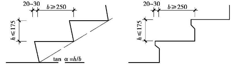 一般讲,楼梯坡度小则平缓,行走舒适,但扩大了楼梯间进深,增加了交通面积和工程造价,故应合理选择。楼梯坡度一般取值为25°~38°,35°较为适宜,30°左右较为通用,小于20°,一般设计为坡道,大于45°则设计为爬梯,如图9.4所示。现以常用的平行双跑楼梯为例说明。