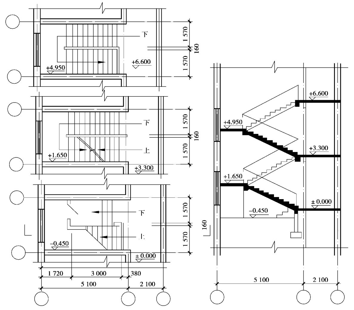 例1:某建筑物开间3300 mm,层高3300 mm,进深5100 mm,为开敞式楼梯。 内墙240mm,轴线居中,外墙360mm,轴线外侧为240mm,内侧为120mm,室内外高差450mm。楼梯间不能通行。