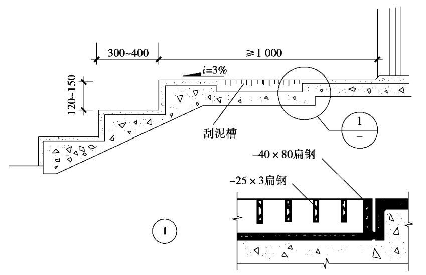 平台设于台阶与建筑物出入口大门之间,以缓冲人流,作为室内外空间的过渡。 其宽度一般不小于1000mm,为利于排水,其标高应低于室内地面30~50mm,并做向外3%左右的排水坡度。 人流大的建筑,平台还应设刮泥槽,如图9.45所示。