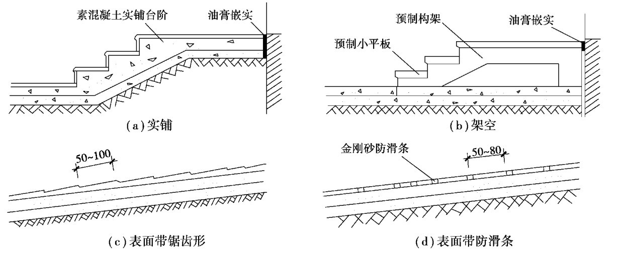 坡道的构造与台阶基本相同,一般采用实铺,垫层的强度和厚度应根据坡道的长度及上部荷载大小进行选择。 严寒地区垫层下部设置砂垫层,坡道为防滑,常将其表面作成锯齿形或带防滑条状。 如图9.46所示。