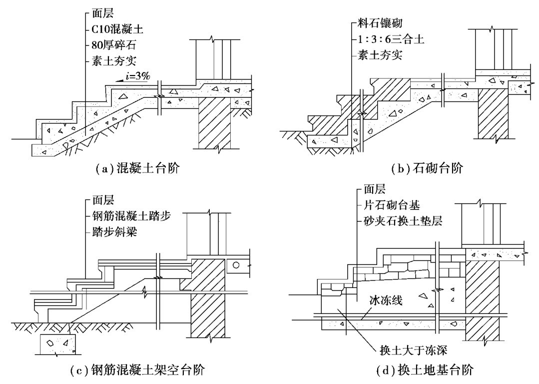 台阶易受雨水侵蚀,日晒,霜冻等影响,其面材应考虑防滑、抗风化、抗冻融性能强的材料制作,如选用水泥砂浆、斩假石、地面砖、马赛克、天然石等。 台阶基础做法基本同地坪垫层做法,一般采用素土夯实、三合土或灰土夯实,上做C10素混凝土垫层即可。 对大体量台阶或地基土质较差的,可视情况改C10素混凝土为C15钢筋混凝土或架空做成钢筋混凝土台阶;对严寒地区的台阶需考虑地基土冻胀因素,可改用含水率低的沙石垫层至冰冻线以下。 如图9.44所示。