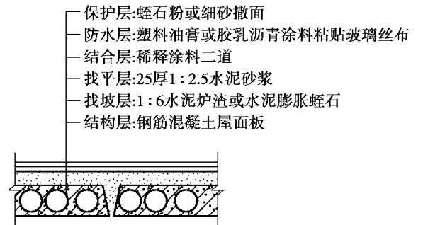 ①找平层。 在屋面板上用1∶2.5~1∶3的水泥砂浆做15~20mm厚的找平层并设分格缝,分格缝宽20mm,其间距不大于6m,缝内嵌填密封材料。 找平层应平整、坚实、洁净、干燥,方可作为涂料施工的基层。