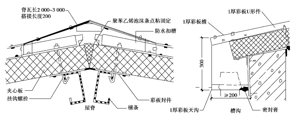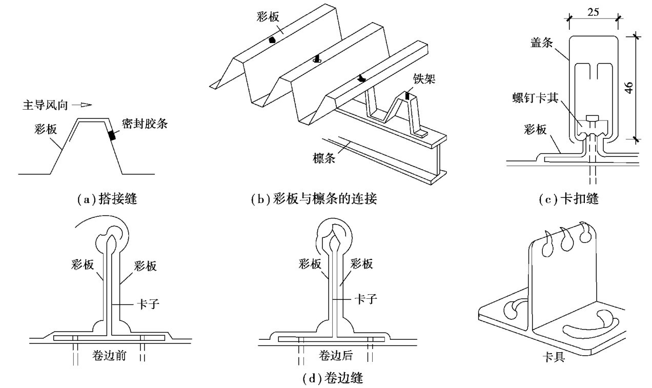 板在安装过程中,需解决好板缝问题。 在板与板、板与配件之间采用铝拉铆钉连接,铆钉应预先涂密封胶,拉铆后,钉头用胶封死。 板缝要以构造防水为主,材料防水为辅。 屋面坡度≤1/10时,上板压下板搭接长度300mm;屋面坡度>1/10时,搭接长度200mm。 每块板应有3个以上支承檩支承,减少和限制翘曲变形。 如图10.34所示。