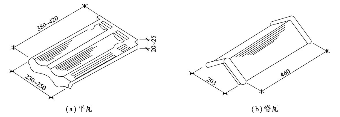 机平瓦即黏土瓦,有平瓦和脊瓦两种。 脊瓦用于屋脊部分,尺寸形状如图10.27所示。 由机平瓦利用瓦上的榫,槽互相搭扣密合,接缝过多。 为避免雨水倒灌,机平瓦屋面坡度不宜小于1∶2(约26°),多雨地区还应加大。