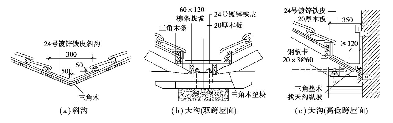 在等高跨,高低跨倾斜屋面相交处和包檐口处形成的纵向沟称为天沟。 在倾斜屋面垂直相交处形成的沟称斜沟。 其断面尺寸,上口宽一般为300~500mm。 天沟底上铺设镀锌铁皮或缸瓦,或改性PVC塑料,并伸入瓦片下面,长度≥150mm。 如图10.32所示。