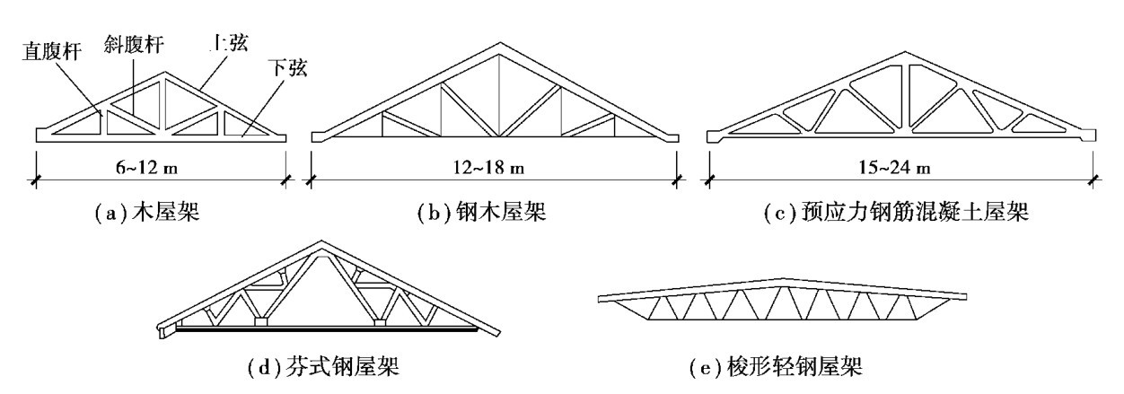 当房屋为大开间时,需设置屋架,一般为三角形。 屋架通常搁置在房屋纵向外墙上或柱上。 屋架的间距与檩条跨度必须相同,等距离排列,檩条两端搁置在屋架上。 当屋架跨度一般不超过12m时,可采用木屋架;不超过18m时,可采用钢木组合屋架;超过18m时,宜采用钢筋混凝土屋架或钢屋架。 常用屋架形式如图10.26所示。