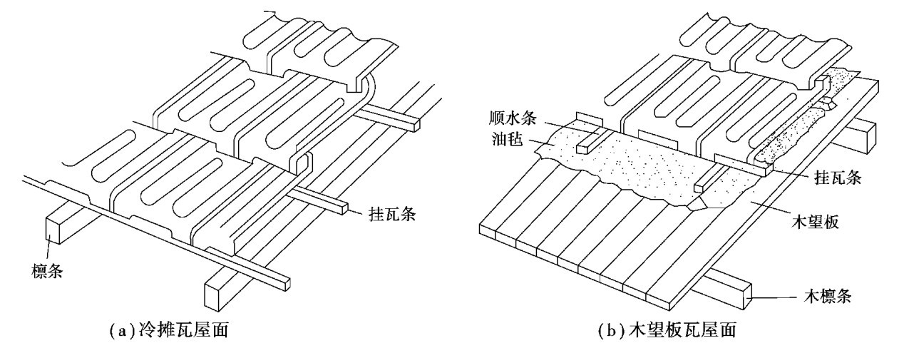 基层为屋面板的瓦屋面有木屋面板和钢筋混凝土屋面板两类。