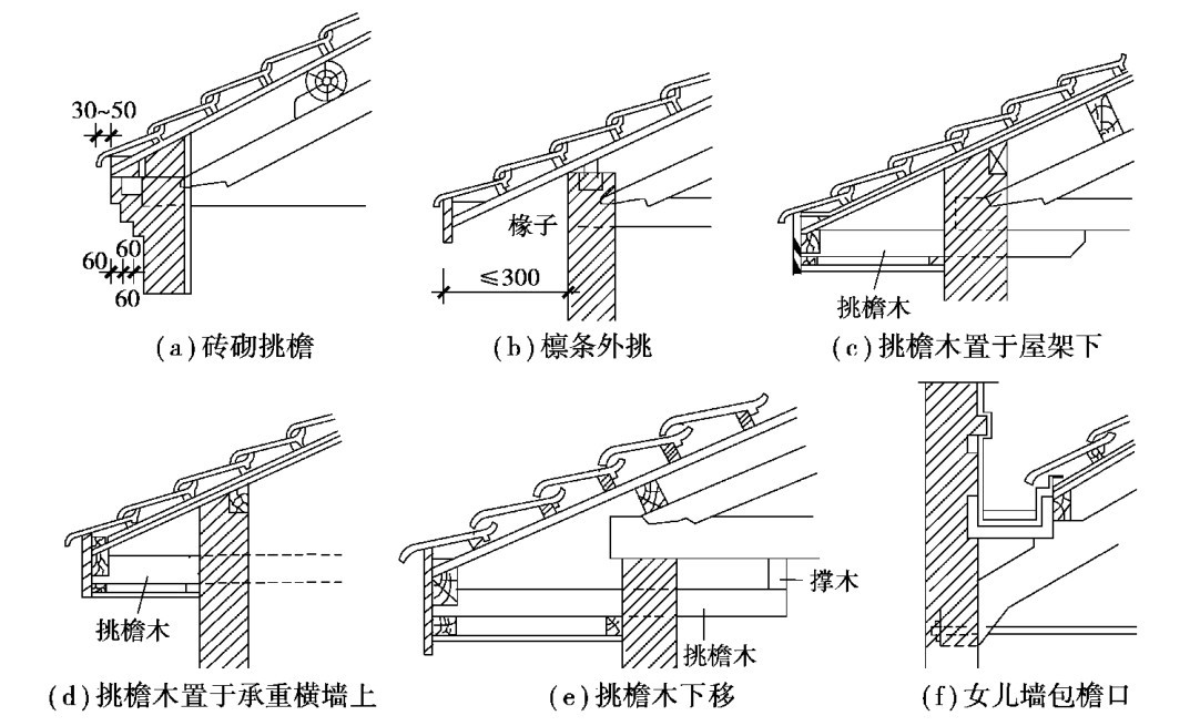 挑椽檐口:利用屋顶层次中已有的椽子或在屋顶的檐边另设椽子挑出作为出挑檐口的支托,如图10.30所示。
